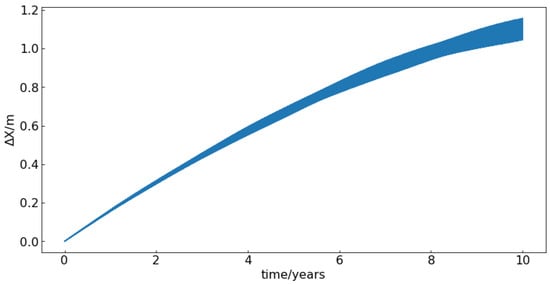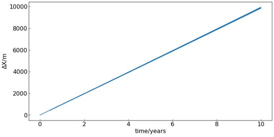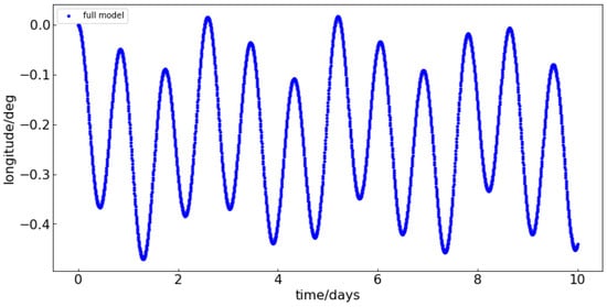 At this point, we have considered factors influencing the motion of Deimos, utilizing a second-order gravity field for Deimos. We have established a dynamical model for the coupled rotation and orbit of Deimos. The initial value of Deimos’ position at the J2000 epoch is provided by MARS097. The integration orbit for both the simple dynamical model and the full model with rotation–orbit coupling established in this study are compared in Figure 3.