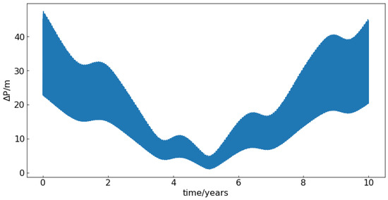 where is the position vector from the perturbing body to Deimos, is the position vector from Mars to Deimos, is the position vector from Mars to the perturbing body, and the Love number of Mars has a value of 0.169 [20]. The solid tide model used in this study does not incorporate the tidal energy dissipation effects of Mars. We referred to previous studies on tidal energy dissipation [22,23,24,25,26], and integrating the established dynamical model over ten years in numerical experiments reveals that tidal energy dissipation effects only cause differences of less than a few meters. Therefore, within the time scale of this study (10 years), we have not considered the influence of tidal dissipation.