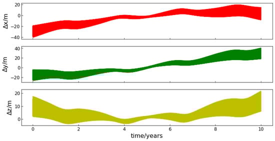 Finally, employing the precision orbit determination method, the computed state transition matrix is synchronously integrated with the orbit. Subsequently, utilizing a least-squares fit to observational data, the calculated results are compared with the MARS097 ephemeris as depicted in Figure 5 and Figure 6.