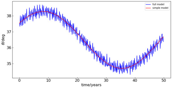 Starting from the J2000 epoch, Figure 7 illustrates the evolution of the angle between the polar axis and the vector (0, 0, 1) in the inertial frame over a 50-year period for both motion models. In the simplified model, the polar axis exhibits relative stability in space, primarily influenced by the precession effect. However, in the full model, accounting for the rotational forces from Mars and the Sun, the polar axis undergoes intricate motion in the inertial frame. Figure 8 and Figure 9 represent the angles between the minimum moment of inertia axis of the moon in the moon-fixed coordinate system and the Mars position vector in the longitude and latitude directions, respectively. The results reveal that the moon’s amplitude in the longitude direction is approximately 0.5 degrees, and in the latitude direction, it does not exceed 2 degrees.