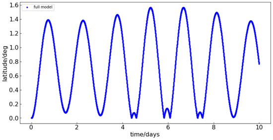 The fundamental distinction between the full model and the simple dynamical model lies in the incorporation of the Deimos’s full rotation in the inertial frame. In the simple model, the moon’s polar axis direction is solely perpendicular to the orbital plane. Nevertheless, when accounting for the complete rotation, the moon’s polar axis undergoes oscillation in the inertial frame as the moon rotates. Figure 7 provides a comparison of the directional deviation of the polar axis under the two motion modes.
