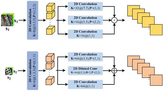 As shown in Figure 2, a group of cubes, denoted as and , with different sizes are fed into the network. Firstly, they pass through a 3D convolutional layer. In the first branch, a larger-sized cube is processed, and 8 convolutional kernels are allocated. The size of each kernel is (). In the second branch, a cube with smaller dimensions is processed, and 4 convolutional kernels are allocated. The size of each kernel is (). To maintain the original size of the cubes, padding is applied. The above process can be represented in the following equation: