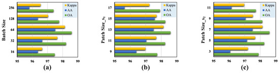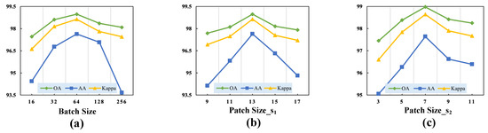 Validation of the optimal hyperparameters with different classification metrics for the Pavia University dataset. (a) Batch size. (b) Size of the cubic patch in the first branch. (c) Size of the cubic patch in the second branch.