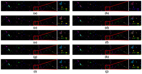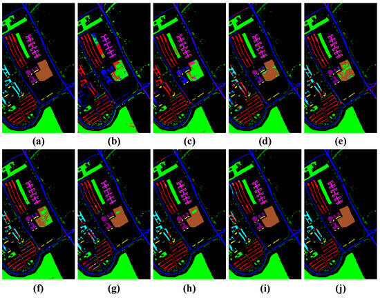 Visualization of classification results using different classification methods with the Pavia University dataset. (a) Ground truth map, (b) SVM (OA = 33.24%), (c) 1D-CNN (OA = 33.63%), (d) 3D-CNN (OA = 48.39%), (e) M3D-CNN (OA = 68.44%), (f) 3D-DLA (OA = 70.49%), (g) hybrid (OA = 77.29%), (h) SSFTT (OA = 87.85%), (i) morphFormer (OA = 87.17%), and (j) the proposed method (OA = 90.72%).