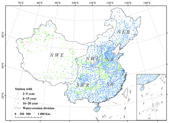 Stations located in six soil erosion sub-zones in mainland China: (1) NWE, the non-water erosion region, which is mainly controlled by wind and freeze–thaw induced erosion; (2) NR, the northern rocky soil region; (3) SWR, the southwestern rocky mountain region; (4) SR, the southern red soil region; (5) NWL, the northwestern loess plateau region; and (6) NEB, the northeastern black soil region. The NR, SWR, SR, NWL, and NEB regions collectively form the water erosion zones (WE) of mainland China.