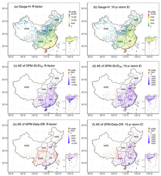 Spatial distribution of R-factors (a) and 10-year storm EI (b) estimated from gauge-observed hourly precipitation (Gauge-H), and absolute errors (AEs) between these indices and those derived from GPM-30-EI30 (c,d) and GPM-Daily-DR (e,f).