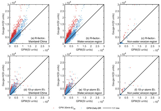 Comparison of two erosivity indices (R-factors and 10-yr storm EI) estimated using gauge-observed hourly precipitation (Gauge-H) with estimates using GPM-30-EI30 and GPM-Daily-DR in mainland China (a,d), the Water Erosion region (b,e), and Non-Water Erosion region (c,f).