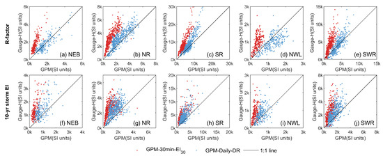 Both GPM precipitation products demonstrate great potential for estimating R-factor and 10-yr storm EI, with accuracy levels comparable to those attained through the interpolation using hourly gauge observations and better than those derived from daily gauge observations.