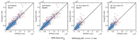 Comparison of R-factors and 10-yr storm EI estimated using bias-corrected GPM-30-EI30 and GPM-Daily-DR versus gauge-observed hourly precipitation in Water Erosion region (WE), using two bias-correction methods (adjust1 and adjust2) through a five-fold cross validation.
