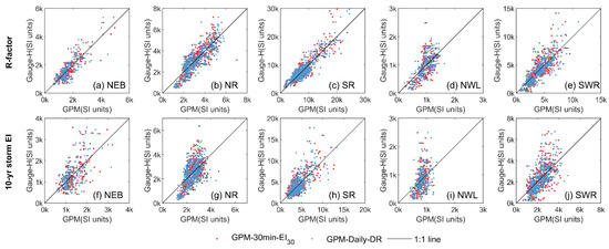 Compared to the estimation of the R-factor, the accuracy in estimating the 10-yr storm EI in these five erosion sub-zones is less satisfactory (Figure 4e–h). NSE values for WE using GPM-30-EI30 and GPM-Daily-DR are −0.13 and 0.36, respectively. Across all sub-regions, the NSE values are either below or near zero. Although GPM-Daily-DR performs slightly better than GPM-30-EI30 in estimating the 10-yr storm EI (Figure 5f–j), the accuracy remains notably low. Nevertheless, the spatial distribution of rainfall erosivity is still broadly preserved, as indicated by the Correlation Coefficients (CC) (Figure 4f).