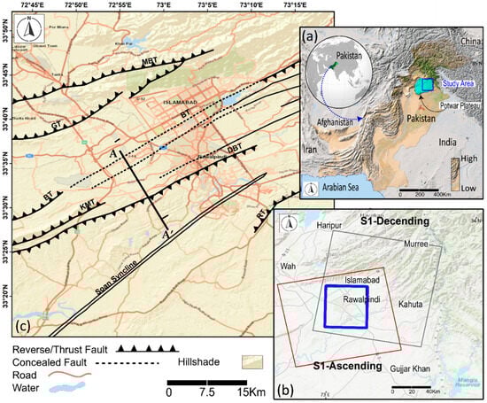 Study area map illustrating the delineation of faults and the coverage of Sentinel-1 imagery over the seismically active Potwar Plateau, focusing on the Islamabad and Rawalpindi cities: (a) the dark blue polygon shows the study area under consideration (topographic map provided by ArcGIS) located in the east of the NPDZ; (b) the grey polygon indicates the descending footprint, and the red polygon shows the ascending footprint of Sentinel-1 IW SLC images used for this study; (c) the structural classification of faults (modified from [32]), where AA’ shows the location of the cross-section discussed in the results.