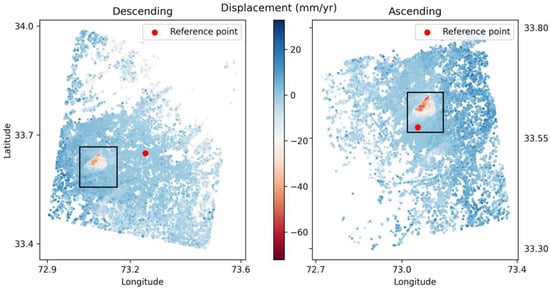 PS points distribution and displacement variation scatter plot of the study area from Sentinel-1A ascending (6 December 2015, to 22 January 2023) and descending (31 March 2017, to 23 January 2023) path, analyzed by non-linear PSInSAR, with deformation zone highlighted by the black polygon. The reference points for both descending and ascending motion are also shown as red points.