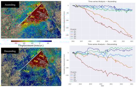 Furthermore, the descending track analysis indicates a noticeable decrease in deformation values, suggesting a downward trend in the area’s deformation pattern. This pattern aligns with observations made from ascending track data. We observed distinct deformation values for PS6 (−181 mm) and PS8 (−95 mm), while in the north, nearby points such as PS7 (−15 mm) and PS9 (−5 mm) exhibited very similar deformation values but with a declining trend.