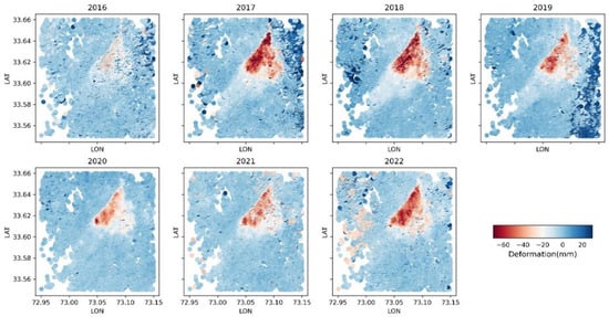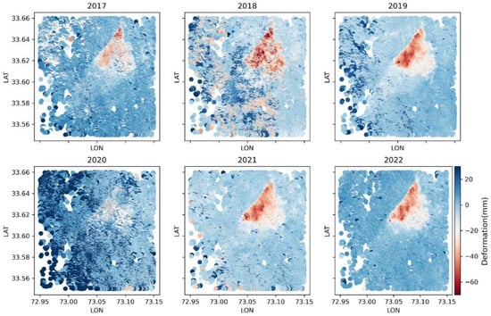 Exploring the temporal evolution of deformation due to the 2017 earthquake near the deformation zone, we crafted yearly deformation maps for both ascending and descending tracks. The ascending track data from 2016 to the present revealed a persistent subsidence trend within the city, illustrating the spatial distribution of deformation and its changes over time (Figure 4). This analysis provides deeper insights into the earthquake’s impact on deformation, highlighting variations across different areas.