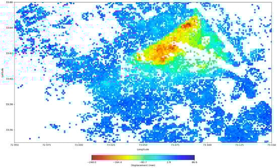 Analysis of the vertical displacement map in Figure 6 reveals critical insights into the deformation patterns within the study area, situated between two uplift zones. This spatial arrangement underscores the significant influence of tectonic forces, challenging a prior study [24] that attributed the deformation solely to water extraction. A detailed examination of Figure 6 shows the deformation zone with a maximum subsidence of −248 mm, a clear marker of considerable ground surface lowering. This substantial subsidence suggests downward movement of the ground surface.