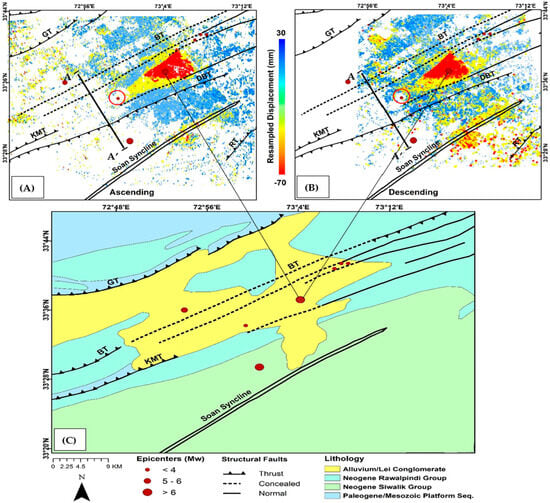The resampled deformation displacement, structural fault lines, geology lines, geology, and recent earthquakes in the study area are shown. (A) Resampled deformation velocity of Sentinel-1 data along an ascending track. (B) Resampled deformation velocity of Sentinel-1 data along the descending track. The red circle along the epicenter shows the 2017 earthquake, whereas AA’ is the cross-section shown in Figure 8. (C) Geological map of the study area displaying lithology and structural faults in the study area.