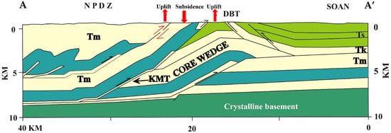 This cross-section spans 40 km, delving into the geology and tectonics up to a depth of 10 km. Several tectonic features can be seen between the NPDZ and the Soan syncline, including the Dhurnal back thrust (DBT) and Khairi Murat thrust (KMT), as shown in Figure 8. The indications surrounding these show uplift, with an upward direction indicating uplift and a downward tip indicating subsidence.