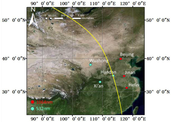 The ground-based aerosol Lidar network consists of six aerosol Lidars. Figure 1 displays the distribution of these six Lidar sites and the CALIPSO transit trajectory (the yellow line), among which Beijing, Jinan, and Hefei deploy independently developed portable infrared Lidars (mIRLidar) [46]. The Lidar system comprises an Nd:YAG laser, receiving optics and subsequent optical units, signal detection unit, hardware control and data processing software. The laser emits at a wavelength of 1064 nm with a spatial resolution of 7.5 m and a temporal resolution of 20 s. The detector uses a sensitive-to-visible Si-APD and near-infrared bands with a bandwidth of 200 MHz. The Lidar system boasts compact dimensions of 200 × 200 × 420 mm, demonstrating robust capabilities for extended outdoor operation. Its lightweight design, weighing a mere 13.5 kg, ensures ease of maintenance and installation. This Lidar system can transmit collected data and equipment status to a cloud server in real-time, where data quality control, the extinction coefficient and depolarization ratio are shown. Additionally, it can be connected to smartphones, computers, and other smart devices for remote control. Wuzhong, Xi’an, and Handan are equipped with three micro-pulse Lidars [47] emitting green light at a wavelength of 532 nm, featuring a polarization channel, spatial resolution of 7.5 m, and a temporal resolution of 1 min. The relevant parameters of the two types of Lidars are shown in Table 1.