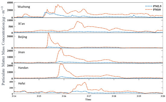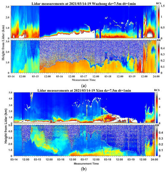 From the night of 14 March to the morning of 16 March (Beijing time), extensive sandstorms swept through the most northern regions of China, influenced by a cyclone from Mongolia and cold air. This marked a significant sandstorm event, the most notable in the past decade [54], leading to widespread haze pollution covering large parts of China. The impact was particularly felt in the northern, central, and eastern regions, significantly affecting air quality. Figure 2 illustrates the variation in particle concentrations in cities where the observation sites of the Lidar network are located. The concentration trends of PM2.5 and PM10 at six sites shows remarkable consistency. In Beijing, Jinan, Handan, and Hefei, the PM2.5 concentrations were 401 μg/m3, 292 μg/m3, 277 μg/m3, and 89 μg/m3, respectively. The corresponding PM10 concentrations were 6450 μg/m3, 2397 μg/m3, 2315 μg/m3, and 382 μg/m3. The PM2.5/PM10 ratios were all less than 0.2 (except for Hefei), indicating that fine particulate matter constituted a small proportion during this sandstorm event, with coarse particles being predominant. At the Wuzhong observation site, there was a brief increase in PM2.5 and PM10 concentrations from 9:00 to 12:00 on 14 March. From 4:00 on 15 March, PM2.5 and PM10 concentrations began to sharply increase simultaneously. PM2.5 reached its peak at 1454 μg/m3, and PM10 reached its first peak concentration of 2185 μg/m3 at 8:00. Subsequently, both concentrations experienced a certain decrease. At 15:00, PM10 sharply increased again, reaching a peak concentration of 3435 μg/m3 and maintaining a high concentration level for the next few days. On 15 March, as the sand dust arrived in Wuzhong and Beijing, there was no significant increase in PM2.5 and PM10 concentrations at the Xi’an site. Instead, PM10 concentrations began to gradually increase on 16 March, while PM2.5 concentrations remained relatively stable. Intense sand dust began to affect Beijing at 8:00 on 15 March, causing PM10 mass concentrations to soar to 6450 μg/m3. The extremely high PM10 concentrations were of short duration and returned to pre-sandstorm levels by 16 March. In Jinan and Handan, around 16:00 on 15 March, PM10 mass concentrations rapidly increased to 2397 μg/m3 and 2315 μg/m3, respectively. The period of high concentration was brief, gradually decreasing to normal levels afterward. Due to its distance from the northern sand source, Hefei experienced minimal growth in particle mass concentrations during this sandstorm event. Around 6:00 on 16 March, PM10 concentrations began to gradually increase to 382 μg/m3, and there was a slight increase in PM2.5 concentrations, but the amplitude was not significant. Hefei was less affected during this sandstorm event compared to other cities, with Beijing experiencing the greatest impact on air quality and Wuzhong having the longest duration of impact.