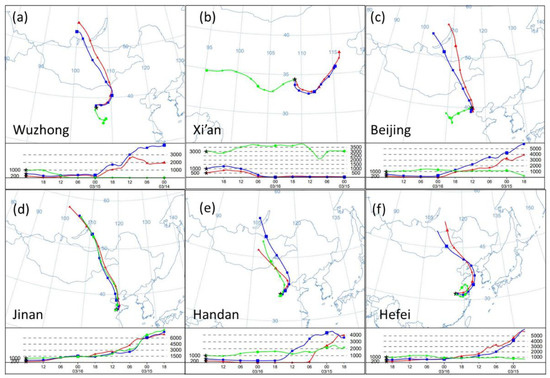 The primary conditions for the genesis of dust storms involve sand sources, robust winds, and thermally unstable atmospheric stratification. Northwestern China hosts numerous desert and desertification regions, such as deserts and the Gobi, characterized by soft surfaces, extensive exposure, and sparse vegetation. Consequently, these areas emerge as pivotal sources of dust storms during the autumn and winter seasons, with the predominant dust storm migration routes aligning westward, northwestward, and northward [55]. As illustrated in Figure 3, to ascertain the origin of dust, the HYSPLIT model was employed to scrutinize the backward trajectories of dust at six Lidar network sites across varied altitudes. Vertical profiles of dust at these six sites are discernible from Figure 4. Intense dust at the Wuzhong, Beijing, Jinan, Handan, and Hefei sites predominantly concentrate below 1500 m, while in Xi’an, it is confined below 3000 m. Accordingly, trajectory analysis was executed at heights of 3000 m, 1000 m, and 500 m for Xi’an and at heights of 1000 m, 500 m, and 200 m for the other five sites.