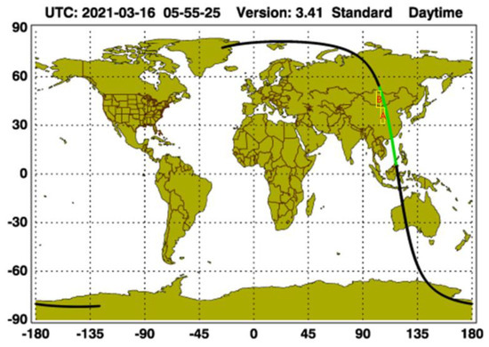 Figure 6 depicts the trajectory of CALIPSO as it transited through the impacted region of the severe dust storm on 16 March 2021 at 5:55 a.m. The trajectory primarily traversed the source areas of this potent dust storm, including Mongolia, Inner Mongolia, Ningxia, Shanxi, and Shaanxi. Area A mainly covers the south-central regions of Ningxia, Shanxi, Shaanxi and Inner Mongolia, while Area B mainly includes northern Inner Mongolia and most of Mongolia. Area A, B in Figure 6 and A, B in Figure 7 are the same Area. These provinces were significantly affected by the dust storm. As shown in Figure 7, it becomes apparent that CALIOP detected dust aerosols while passing through Inner Mongolia, Ningxia, Shanxi, Shaanxi, and Mongolia. In Figure 7, Area A predominantly covers the central and southern regions of Ningxia, Shanxi, Shaanxi, and Inner Mongolia, while Area B mainly includes the northern part of Inner Mongolia and most regions of Mongolia. According to the data presented in Area A of Figure 7a, as the satellite passes over Ningxia, Shanxi, Shaanxi, and the central and southern regions of Inner Mongolia, a continuous aerosol layer is evident below 4 km. The backward scattering coefficient for this aerosol layer exceeds 5 × 10−3 km−1sr−1, indicating a notably high aerosol concentration. Among these regions, Ningxia, Shanxi, and Shaanxi display the highest aerosol concentrations. In Area B of Figure 7a, where the satellite primarily traverses Mongolia, a layer of aerosols with a heightened concentration is observed near the surface, approximately 1.2 km above ground level. The backward scattering coefficient for this aerosol layer reaches 1 × 10−2 km−1sr−1. Relative to the aerosols in Area A, those in Area B exhibit significantly higher concentrations and a broader range of variation. The combination of Figure 7a,b reveals that the dust aerosol heights in Ningxia, Shanxi, and Shaanxi range from approximately 0.4 km to 3.2 km, with the dust cloud tops in the central and southern parts of Inner Mongolia ranging from about 2 km to 4 km. In the northern part of Inner Mongolia and Mongolia, dust aerosol heights range from 1 km to 4.2 km, with a relatively uniform distribution. The intensity, prolonged duration, and extensive impact of this severe dust storm weather are evident. The signals detected by CALIPSO during its transit from northern Inner Mongolia to entering Mongolia indicate the presence of a high-altitude dust belt at around 3 km from south to north. It can be preliminarily determined that Mongolia is one of the main source regions for this intense dust storm weather.