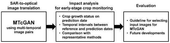 Despite the efforts to improve performance, noticeable visual differences (a loss of textures and spectral distortion) from actual optical images are still observed in the hypothetical optical images. In addition to the discrepancy between SAR and optical images, information deficiency in SAR-based features may result in the generation of a hypothetical optical image that significantly differs from the actual optical image. Therefore, it is necessary to utilize useful information to restore objects and features in the optical image in addition to improving the model structure. A promising approach to improve the performance of SAR-to-optical translation is to extract useful information from various input images. Periodic image acquisition over the area of interest can facilitate the utilization of additional temporal information for SAR-to-optical translation. For example, multi-temporal cGAN (MTcGAN) utilizes SAR and optical image pairs acquired on the same or a similar date (hereafter referred to as a reference date) as well as a single SAR image acquired on a prediction date for extracting temporal change information from multi-temporal images [17,38]. Due to its ability to integrate additional information from an optical image on the reference date, it performed better than conventional SAR-to-optical image translation methods. In particular, the performance of MTcGAN can be further improved by utilizing different input data combinations that can provide rich information for SAR-to-optical image translation. However, such dependency on the input data of MTcGAN implies a need for extensive evaluation. To address this, most previous studies have aimed to utilize an optical image taken on a reference date that is as close as possible to the prediction date to ensure satisfactory prediction performance [17,38]. As the physical conditions of crops change rapidly during the crop growth period, it is essential to analyze the impact of various input cases, such as by considering different image acquisition dates and crop growth stages. However, to the best of our knowledge, the impact of varying input data combinations on the performance of MTcGAN in the context of early-stage crop monitoring has not yet been assessed so far.