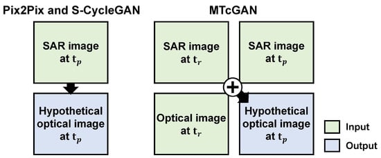 MTcGAN is a modified cGAN that uses additional SAR and optical image pairs acquired on the reference date (hereafter referred to as ) as conditional variables along with the SAR image acquired on the prediction date (hereafter referred to as ) [17,38].