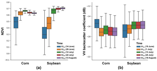 Boxplots of spectral and scattering distributions of corn and soybean calculated from individual Sentinel-1 and -2 images for the indicated image acquisition dates: (a) normalized difference vegetation index (NDVI); (b) VH backscattering coefficient. S1 and S2 denote the Sentinel-1 and -2 images, respectively.