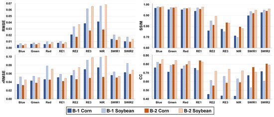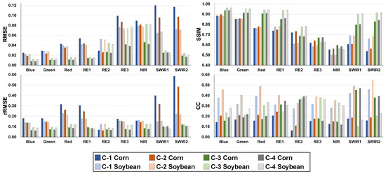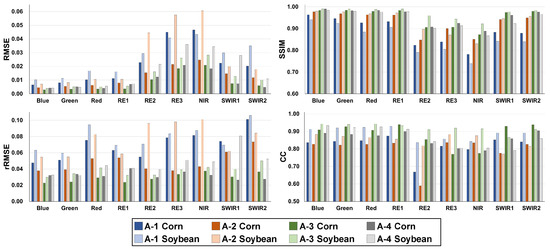 Figure 7 presents four accuracy statistics for corn and soybean in the four A cases of MTcGAN. Lower RMSE values were observed for the A-1 and A-2 cases, corresponding to the early growth stages, than the other two cases. As shown in Figure 5, substantial differences in NDVI were observed between and when comparing soybean to corn. As a result, the RMSE values of corn and soybean differed by about twofold in the case of A-2. These results may also be due to the consistently lower variation in NDVI for corn than for soybean. On the other hand, the A-3 case exhibited superior prediction performance as it had the highest CC of NDVI between and (see Table 4). During the early growth stages (A-1 and A-2), the rRMSE values for red, NIR, RE3, and SWIR2 were higher than other bands. Consistently high values of SSIM and CC were obtained for most bands except NIR and RE2. A high variation in NDVI due to rapid crop growth affected the prediction performance, but the magnitude of errors was small, with RMSE up to 0.06.