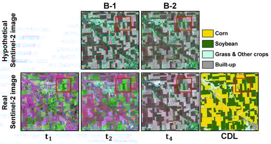 Hypothetical Sentinel-2 images generated by MTcGAN and the real Sentinel-2 images (NIR–SWIR1–RE2 as RGB) for the two B cases with the CDL. Red boxes indicate soybean parcels where rapid changes occurred. Image acquisition dates indicated as t can be found in Table 1.