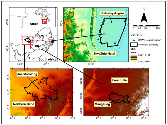 Climate data were obtained from the South African Weather Services (SAWS). The data contained daily rainfall (mm), as well as the minimum and maximum temperature (°C). The data were further converted into monthly and yearly rainfall and temperature to make the analysis easier. Data wrangling was performed to ensure that the data were consistent and accurate. The stations where the data were obtained are at the following locations: Maputaland (27.39°S, 32.18°E); Joe Morolong (27.47°S, 23.45°E; 27.43°S, 23.43°E); and Mangaung (29.1°S, 26.3°E).