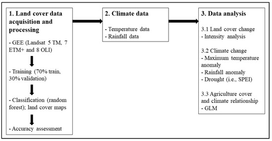 Quantifying land use and land cover change becomes increasingly important in rural landscapes where biophysical (e.g., climate) and socio-economic factors have the potential to negatively affect the livelihoods of the local people. Remote sensing provides an opportunity to quantify land use and land cover change over broad and local scales. Remotely sensed data have been used in a wide range of ecological studies such as change detection (e.g., urban expansion), land cover and vegetation mapping, and environmental monitoring [16]. Remote sensing has also been used to map the extent of agricultural areas and predict future trends around the world [17]; however, mapping the spatial changes of small-scale crop farming is important as the changes may have implications for understanding the resilience of households and rural systems as a whole under climate change. The availability of free long-term remotely sensed data allows researchers to quantify land use and land cover change in rural communities and its drivers, an area that requires more research given that the drivers of land use and land cover change may differ based on the scale at which the analysis is performed.
