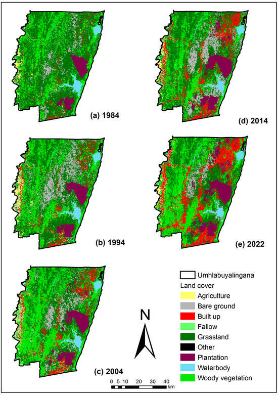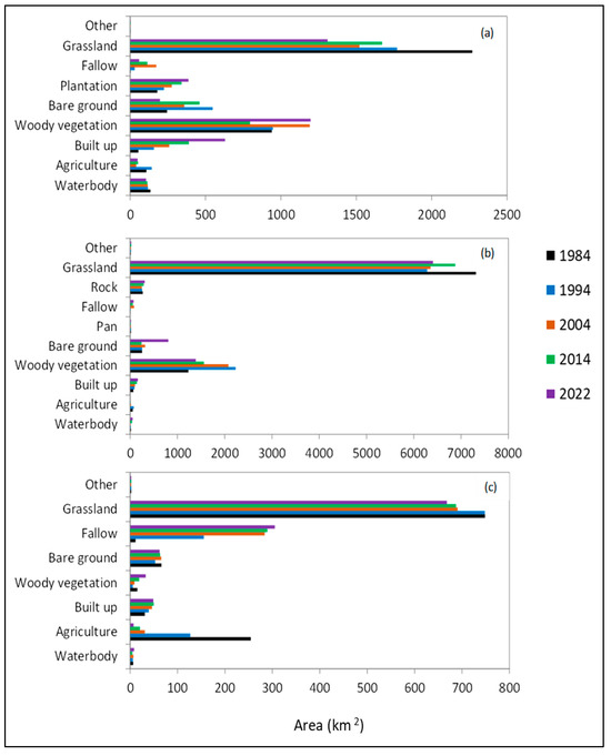 Grassland was the dominant cover at all three sites; however, it showed a declining trend over the study period (Figure 6a–c). Another common trend across the three sites was the substantial overall decline in the area covered by active agricultural land, while the area covered by fallow land increased. In Umhlabuyalingana, agricultural land area decreased from 107.5 km2 in 1984 to 49.5 km2 in 2022 (Figure 6a). In the Joe Morolong area, agricultural land area decreased from 54 km2 in 1984 to 1.6 km2 in 2022 (Figure 6b). In Mangaung, agricultural land area decreased from 254.6 km2 in 1984 to 7.1 km2 in 2022 (Figure 6c). Grassland remained the dominant land cover, although having declined, while there was a substantial increase in built up, woody vegetation, and plantation in Umhlabuyalingana over time (Figure 6a). The landscapes in Joe Morolong (Figure 6b) and Mangaung (Figure 6c) saw a gradual decline in grassland and a considerable decline in agricultural land (in Mangaung specifically).