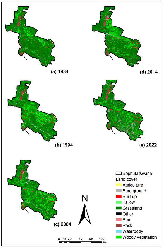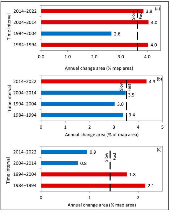 The rate of land cover change was variable at all three sites. In Umhlabuyalingana, the rate of change was fast (compared to the uniform rate of 3.6% per annum) in all the observation periods except for the period between 1994 and 2004 (Figure 7a). In Joe Morolong, the rate of change was slow (compared to the uniform rate of 3.5% per annum) in all the observation periods except for the period between 2014 and 2022 (Figure 7b). The landscape in the Mangaung area experienced a fast rate of change compared to the uniform rate of 1.4% per annum in the first two observation periods and a slow rate of change in the last two decades (Figure 7c).