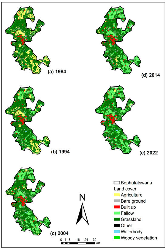 The nature of the change for each land cover category in the former homeland area in Umhlabuyalingana was characterized by active gains of fallow (in the first three time intervals), woody vegetation (two time periods), and built up areas (all time intervals). Grassland was characterized by active loss intensity during the analysis period, except for the 2004–2014 time interval, where it gained actively (Figure 8). Agriculture was dynamic, and this category showed active gain and loss; however, the loss intensity was greater than the gain, particularly between 1994–2004 and 2014–2022 (Figure 8b,d).