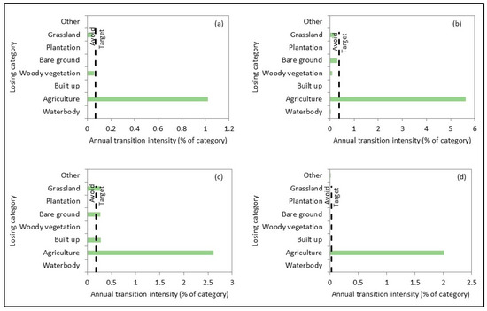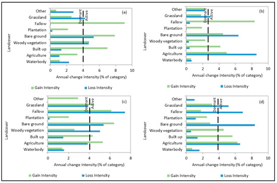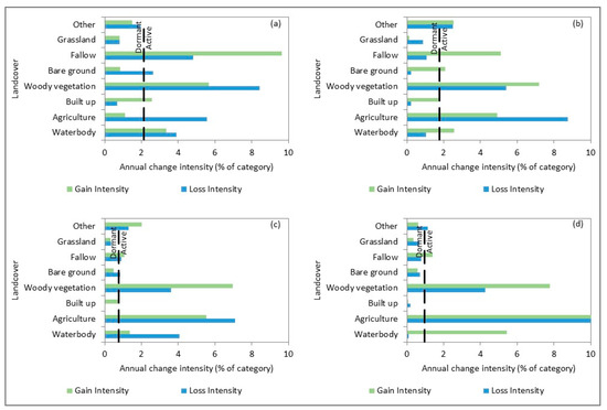 Annual change intensity per category for (a) 1984–1994, (b) 1994–2004, (c) 2004–2014, and (d) 2014–2022 in the former homeland area found in Mangaung local municipality, Free State, South Africa. The dashed line in the graphs shows the uniform intensity, and if the bar falls left of the line, the intensity is dormant, while if the bar is to the right of the line, the intensity is active.