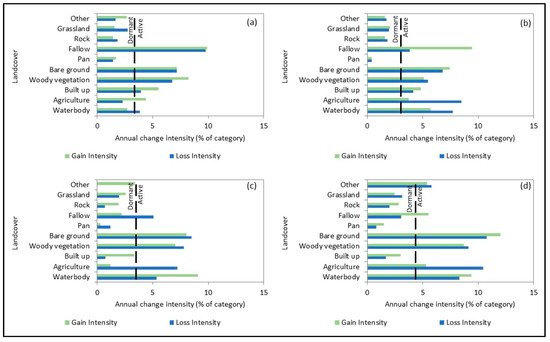 Annual change intensity per category for (a) 1984–1994, (b) 1994–2004, (c) 2004–2014, and (d) 2014–2022 in the former homeland area found in Joe Morolong local municipality, Northern Cape, South Africa. The dashed line in the graphs shows the uniform intensity, and if the bar falls left of the line, the intensity is dormant, while if the bar is to the right of the line, the intensity is active.