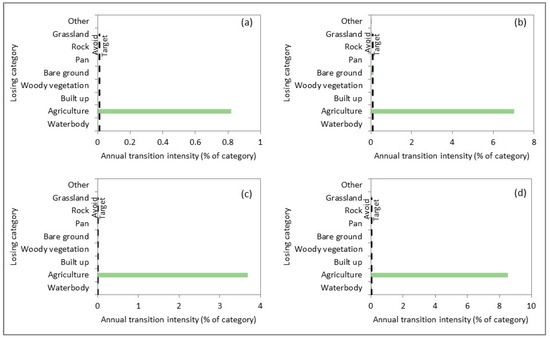 The former homeland area in Mangaung was characterized by dormant loss and gain intensity of grassland, while woody vegetation showed an active gain and loss for all the time intervals (Figure 10). Built up areas showed active gain for the first three time intervals, while from 2014–2022, the gain was not active (Figure 10d). Agriculture loss intensity was active and greater than the gain intensity (Figure 10).