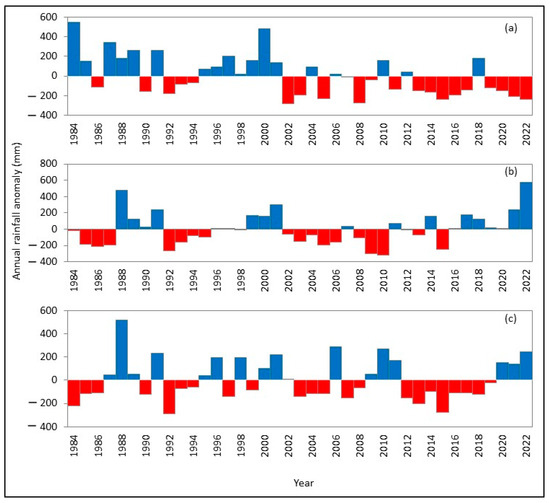 Rainfall anomalies for the three South African Weather Service stations found at each case study site. (a) Umhlabuyalingana station, (b) Joe Morolong station, and (c) Mangaung station. Blue bars on the graph indicate above average rainfall, while red bars indicate below average rainfall against the mean rainfall for the entire study period.
