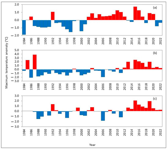 Maximum temperature anomalies for the three South African Weather Service stations found at each case study site. (a) Umhlabuyalingana station, (b) Joe Morolong station, and (c) Mangaung station. Blue bars on the graph indicate below average maximum temperature, while red bars indicate above average maximum temperature against the mean maximum temperature for the entire study period.