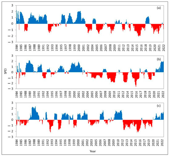 The Standardized Precipitation Evapotranspiration Index (SPEI) of the (a) Umhlabuyalingana, (b) Joe Morolong, and (c) Mangaung areas between 1984 and 2022, South Africa. Negative values indicate a dry period (red bars), while positive values indicate a humid to wet period (blue bars).