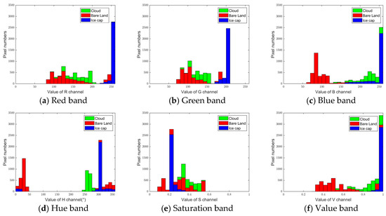 As mentioned in Section 2.1.1, RGB data were used in this study. Although the green band was not observed but was constructed by combining the red and blue bands, in order to construct more features, the green band was still considered as a band for feature selection. Nonetheless, identification of ice caps solely through RGB bands proves challenging. To search for suitable parameters to construct a new feature index, the HSV color system was also investigated. The HSV color system, in which H represents hue, S denotes saturation, and V indicates value, was proposed in 1978 [20]. HSV is a hexcone model transformed from the RGB cube [21]. Compared with the RGB color system, HSV is more related to human vision in terms of color sensitivity [22,23]. More importantly, HSV shows more robust results to luminance changes and shadow effects than RGB, which has three channels that are attached to brightness [24]. Therefore, the HSV color system is more suitable for segmentation, especially for some data with complex backgrounds [25]. The functions of each channel of HSV are calculated as follows: