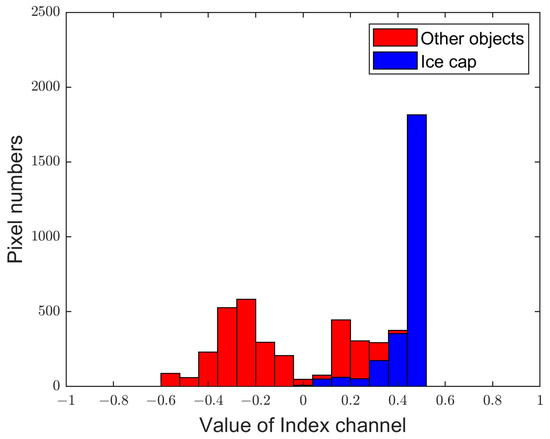 After constructing the characteristic index, Otsu’s method was chosen as the binary segmentation method for extracting the ice cap. The Otsu algorithm is a classic segmentation method that automatically selects the global threshold value according to the distribution of the gray level in its histogram [33]. The main idea of this algorithm is to determine the optimal threshold that can maximize the variance between the target and the background, and it has better accuracy results when applied in remote sensing classification [34,35,36]. The Otsu algorithm can select appropriate segmentation thresholds for images with obvious bimodal features in histograms, but it has poorer results for features with unimodal or inconspicuous bimodal histograms. Therefore, it is necessary to construct features with obvious bimodal characteristics to distinguish the ice cap from other objects [37].