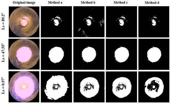 Using the blue-band Otsu method to divide the ice cap segmented by the index Otsu method also removes bare land with low reflectivity in the mid-latitudes, but sometimes the ice cap is misclassified as other objects, as shown in Figure 6 with Ls 89.2° and Table 2, with an AR of 84.72%. The reason for this is that the proportion of the ice cap in the index segmentation results is too high, and the effectiveness of Otsu threshold segmentation will be reduced [38].