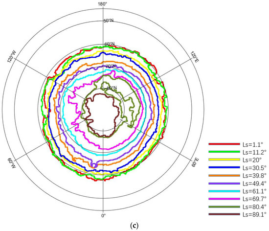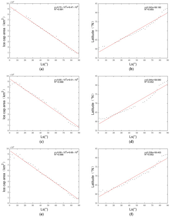 As shown in Figure 9b,d,f, the average latitude of the ice cap ablation boundary is approximately the same as the results of the reference and is approximately linear with Ls. The linear fitting R2 values, measuring 0.955, 0.952, and 0.952, respectively, indicate a strong fitting effect. The change rate of the average latitude of the ice cap ablation boundary in the three years was approximately the same, increasing by 0.24° for every degree of Ls. When Ls ranges from 0° to 10°, the average latitude of the ice cap ablation boundary shows no significant change. Within ranges of 10° to 60°, the average latitude of the ice cap ablation boundary changes at a constant speed. When Ls is from 60° to 80°, the change speed of the average latitude of the ice cap ablation boundary accelerates.