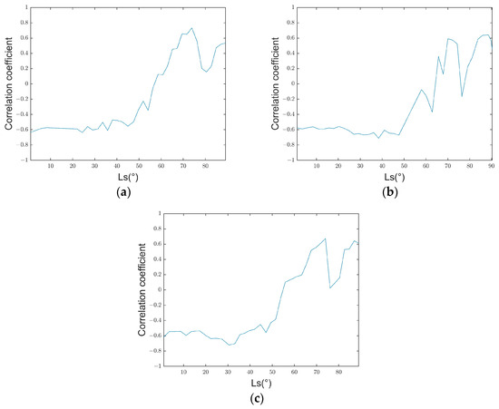 Correlation coefficients between the elevation of pixels near the average latitude of the ablation boundary of each Ls and whether they are ice caps: (a) Correlation coefficient between the elevation of pixels near the average latitude of the ablation boundary of each Ls and whether they belong to the ice cap in MY25. (b) Correlation coefficient between the elevation of pixels near the average latitude of the ablation boundary of each Ls and whether they belong to the ice cap in MY26. (c) Correlation coefficient between the elevation of pixels near the average latitude of the ablation boundary of each Ls and whether they belong to the ice cap in MY28.