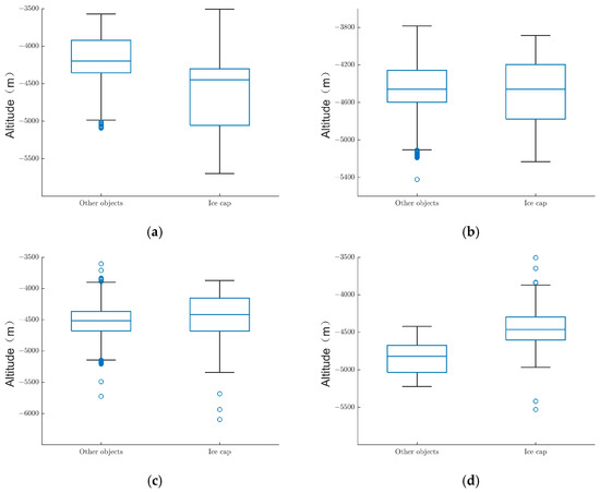 Four images in MY25, with Ls of 40.18°, 56.25°, 60.75°, and 69.45°, were selected to construct box plots from the seasonal ice cap extraction results and DEM near the average latitude of the ablation boundary, as shown in Figure 11a–d. At 40.18°, the lower quartile of the elevation of the non-ice-cap objects is approximately equal to the upper quartile of the elevation of the ice cap, and most of the elevations of the non-ice-cap objects are higher than the elevation of the ice cap. At 56.25° and 60.75°, there are no significant differences between the ice cap and other objects. At 69.45°, the lower quartile of the elevation of the ice cap is greater than the upper quartile of the elevation of the other objects, and the elevation of most of the seasonal ice cap is higher than that of the other objects, which is consistent with the results shown in Figure 10.