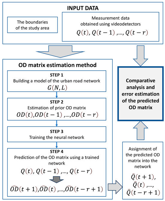 Methods for estimating the OD matrix using traffic counts differ primarily in the data acquisition process and the techniques for building the traffic assignment. The traffic data used to estimate the OD matrices can be obtained in various ways. The most widely used data acquisition methods include vehicle license plate registration [17,18,19,20], mobile phone data analysis [21,22,23,24], FCD (floating car data) [25,26,27], traffic intensity and speed measurements [28], vehicle GPS position recording [29], and others [30,31]. Data obtained from video sensing devices are also an important source of information on traffic flow in a section of the road [2], especially when it is necessary to estimate the OD matrix in real time.