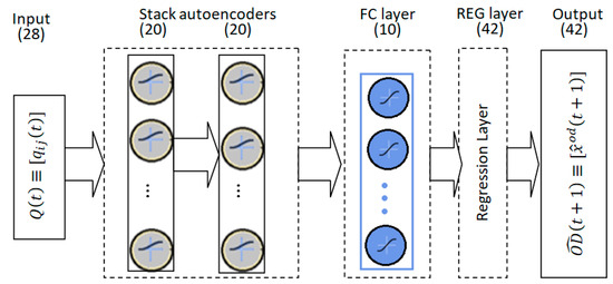 A deep learning network for the prediction of the OD flow matrix consists of an input DLNA layer, an FC layer, and a REG layer as the output layer. The traffic flow corresponding to successive 15 min intervals was given at the network input. The number of entries was 28 values of traffic flows on links registered in the same interval.
