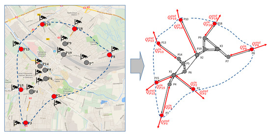 The road network has been mapped in the form of a directed graph G(N,L), where N corresponds to a set of nodes and L—to a set of links of this graph. The vertices are divided into two subsets: